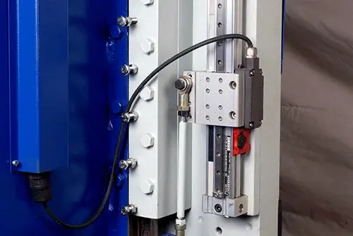 The high precision Imported Linear Scales are fitted on the Steel Frame attached to Machine Bed and it is independent of the side frame. This steel frame supports the sensors which takes positional readings directly from the Ram on the centre line of the Main Pressure Cylinder. The Scales are Self Aligned type fitted with Bearings which always give correct Position of the Upper Tool with respect to Lower Tool. These Scales are mounted on both sides of the CNC Synchro Hydraulic Press Brakes Machine in combination with the Y1 and Y2 axes control, thereby providing accurate synchronization between the Cylinders to 0.01 mm.